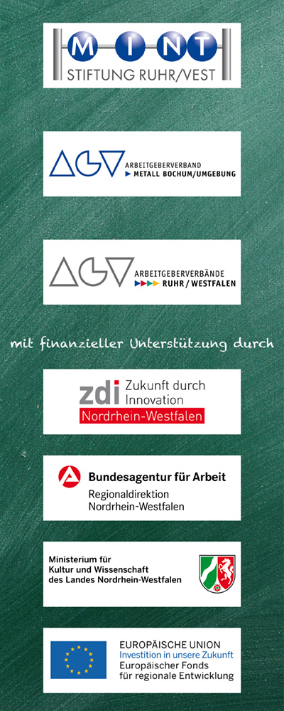 Die Fördermittel für Maßnahmen zur vertiefenden Studien- und Berufsorientierung, die über die Gemeinschaftsoffensive Zukunft durch Innovation.NRW den zdi-Netzwerken im zdi-BSO-MINT-Programm zur Verfügung stehen, werden gespeist aus Mitteln der Bundesagentur für Arbeit - Regionaldirektion Düsseldorf und dem Ministerium für Kultur und Wissenschaft des Landes NRW.